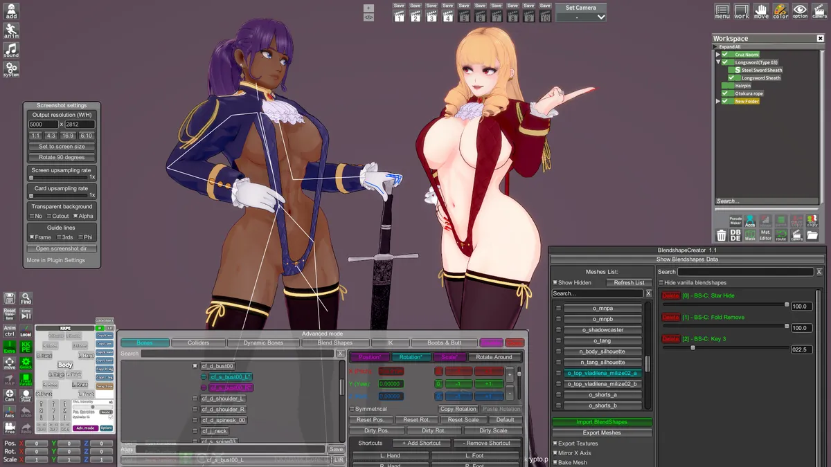 A lot of work is pulled by the initial characters, who have all sorts of custom textures and blend shapes added to them, but even then I have to customize everything for each picture. My base character cards are designed with a "serious" body standard. There are artistic exaggerations still, but more in a general art sense where I'm assuming I'm not just going to use them for smut. Even if I end up mostly making lewd pics, this works out, because every lewd picture should be exaggerated differently.