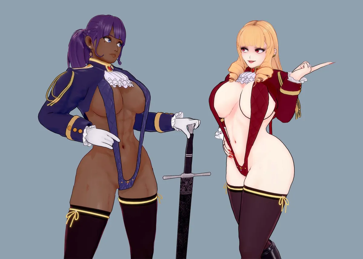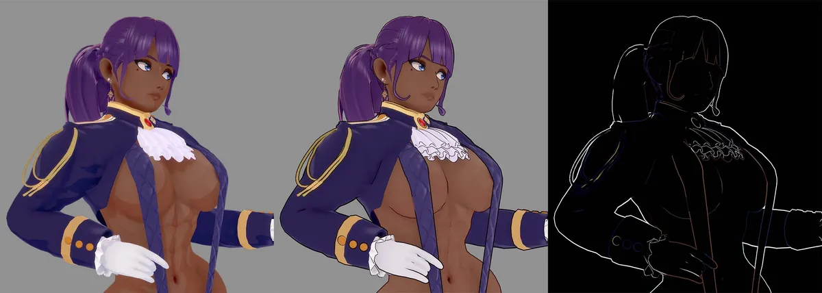 Basically more exaggeration and a few fixes. Often I can also use the face tool to future refine expressions and stuff before doing some drawing over. From here it's just a matter of using masks to erase lines and shading I don't like and drawing in my own. At that point, that's just normal drawing stuff, which of course means a messy PSD with like 100 layers or whatever. Problem areas of note are jagged polygonal breasts and hips, and also clipping issues around the cravat and aglets. Parts of Sinlen's sling had to be fixed too. I also filled in any weird gaps I could in the line art, which is most visible in the hair. That said, I detailed almost everything on this one. It feels like my most successful "Fake 2D" picture so far, even though I didn't even set out to do that. It just seems to be an increasing result of thinking about and using 3d in a 2d process.