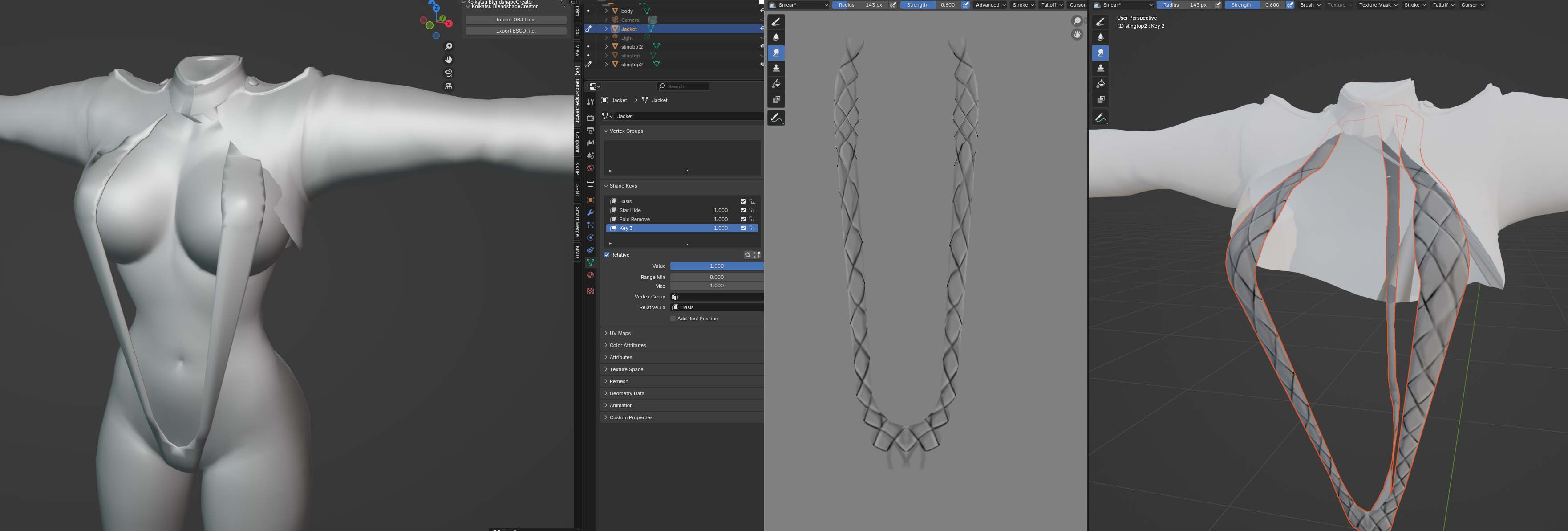 Problems like these are fixed in Blender. There is a great Koikatsu (and HS2) plugin, BlendshapeCreator I use a lot. I explore a baked version of the parts of the outfit I want to edit, with the body for reference, and I make blend shapes -- basically vertex offsets -- to fix the fit of the close. There can be all sorts of little headaches in this process and it's never perfect, so I try to basically overdo all my edits a bit and dial them in inside Koikatsu by tweaking the sliders. I also used Blender to paint the quilt texture. I knew I had to paint it because anything like a Sling Bikini is going to have messed up UVs that won't look good with a tiled texture slapped over it. Honestly you can tell from the blender screenshot texture isn't even that good. It doesn't have to be. It just has to be good enough for one picture.